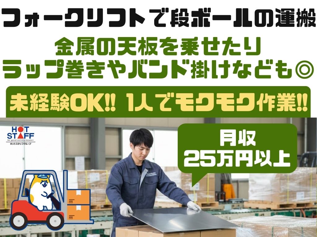 フォークリフトで段ボールの運搬!未経験OK・1人でモクモク作業・月収25万円以上☆彡