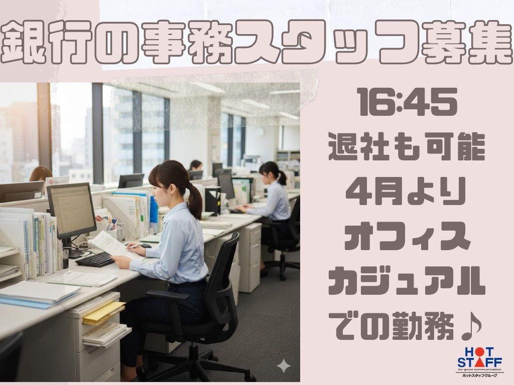 【※経験を活かせる!】" 銀行での事務スタッフ " 16:45退社も可能・4月よりオフィスカジュアル勤務♪