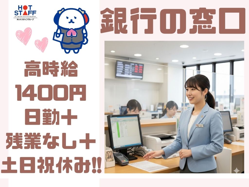 銀行の窓口スタッフ \ 未経験OK・高時給1400円・日勤+残業なし+土日祝休み! /