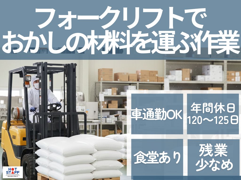 【フォークリフト】おかしの材料を運ぶ作業/覚えること少なめのルーティンワーク♪500円~食堂利用可能!【1380円の高時給】