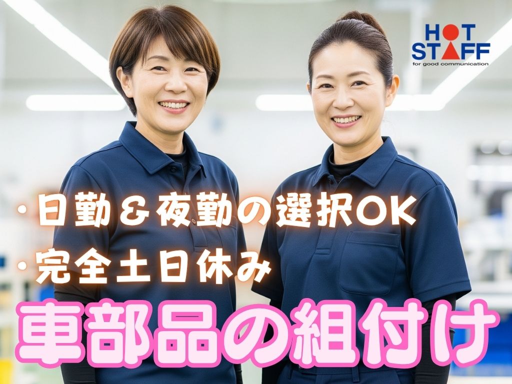 《1つの作業に集中できる・車部品のかんたん組付け》日勤&夜勤選べます/完全土日休み/職場の雰囲気◎
