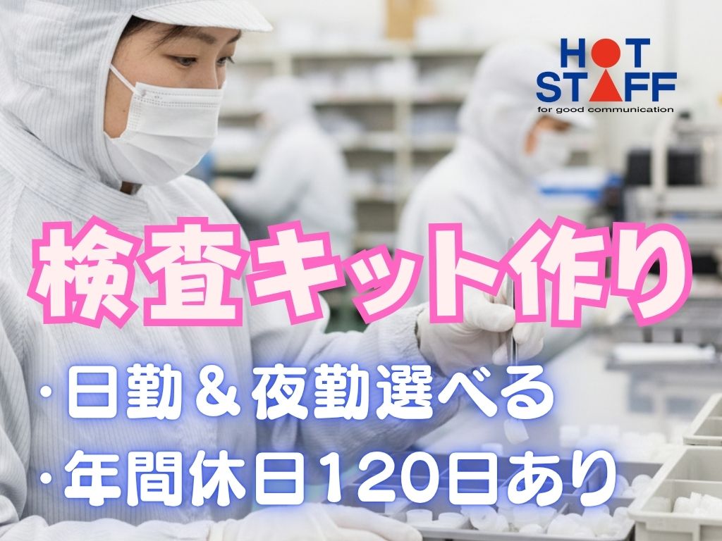 《未経験でもできる軽作業・検査キット作り》日勤&夜勤選べる/年間休日120日あり/安定勤務が可能