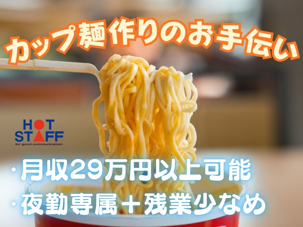 《月収29万円以上可能・カップ麺作りのお手伝いスタッフ》夜勤専属/完全土日祝休み/残業少なめ