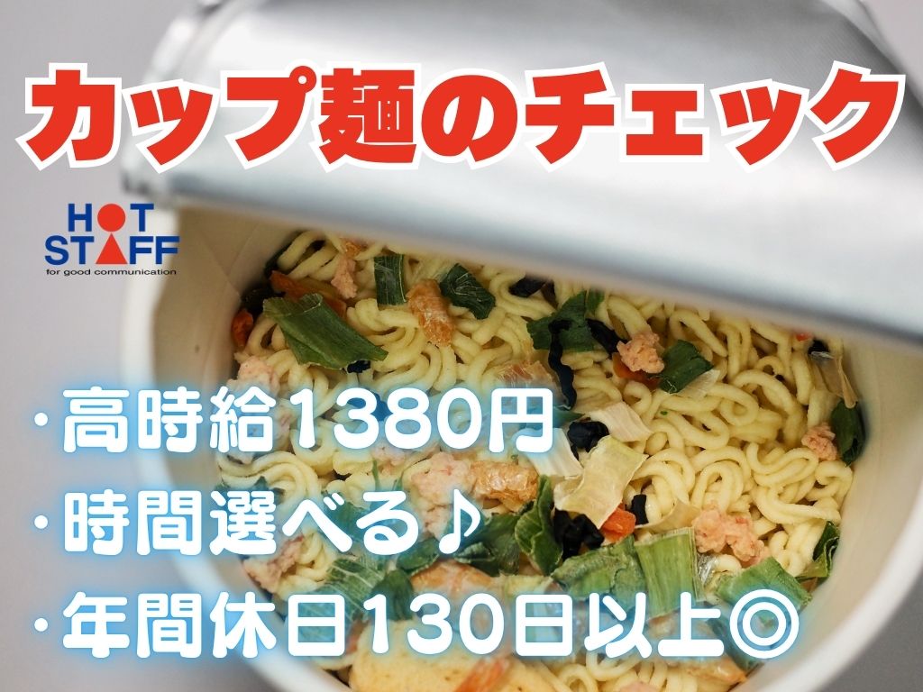《未経験でもできる軽作業・カップ麺の簡単チェック》日勤&夜勤選べる/年間休日130日以上あり