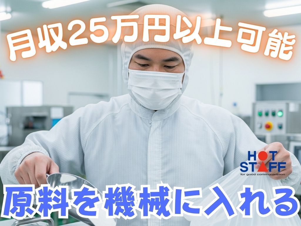 《シンプル作業で安心・原料を機械に入れるおしごと》日勤専属/残業少なめ/月収25万円以上可能