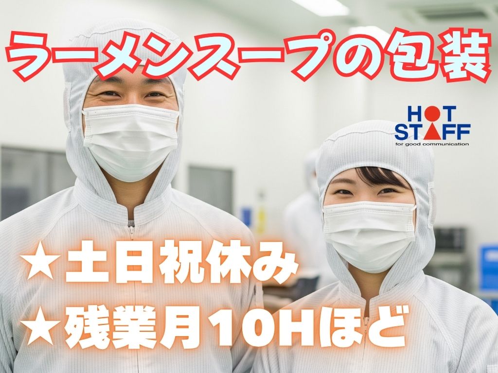 《未経験OK・ラーメンスープのパック詰め》土日祝休み/残業月10Hほど/空調完備の食品工場
