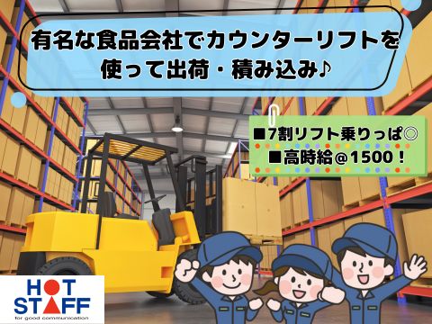 7割リフト乗りっぱ◎/高時給@1500/有名な食品会社でカウンターリフトを使って出荷・積み込み