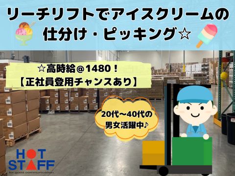 【高時給@1480!正社員登用チャンスあり】リーチリフトでアイスクリームの仕分け・ピッキング