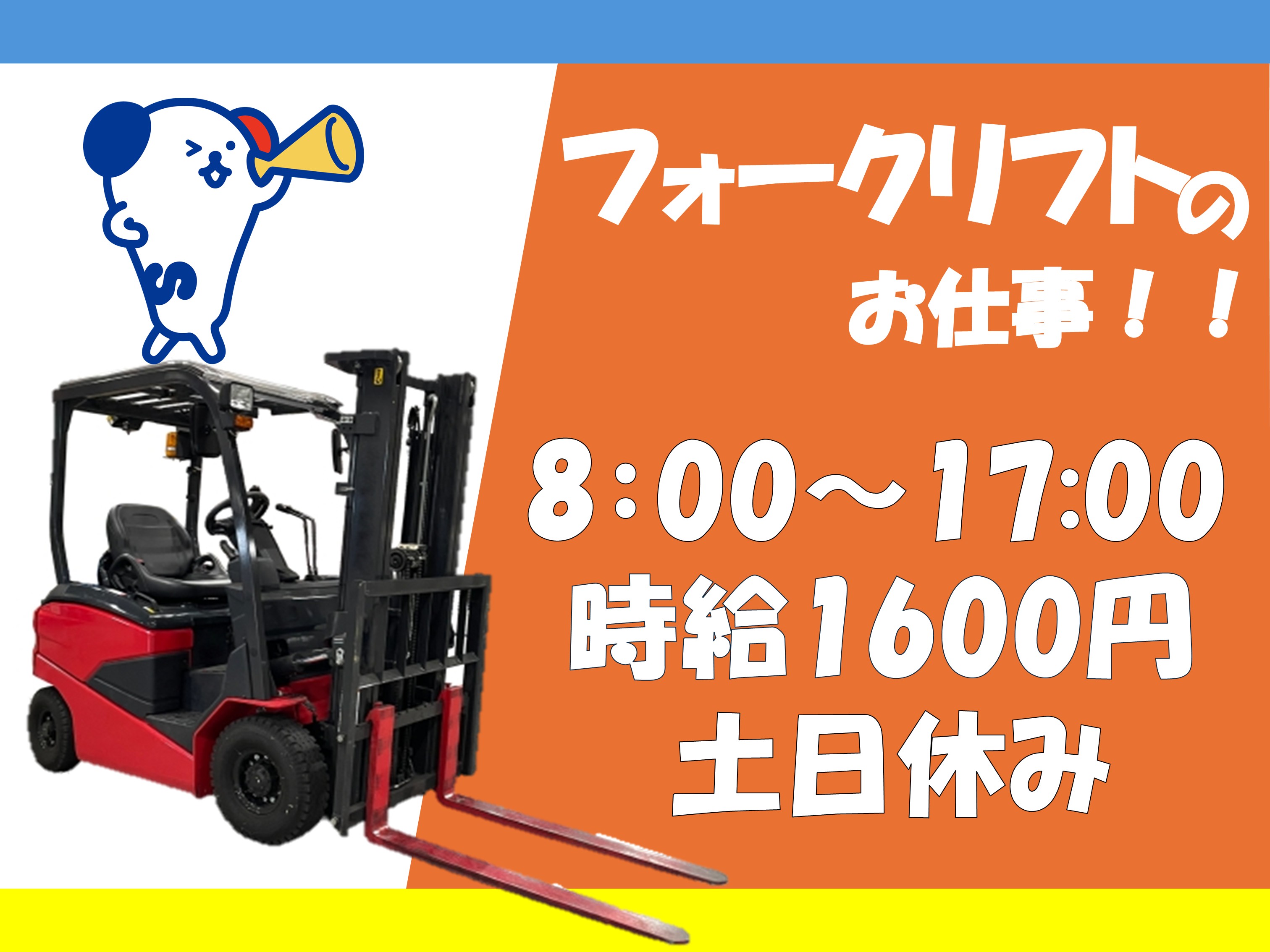 【日勤7:30~16:30/時給1600円】年間休日120日以上/土日休み★物流倉庫内のリフト作業★