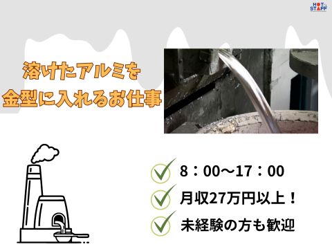 《残業ナシで月収27万円以上★》溶けたアルミを金型に流しいれる作業/日勤のみ