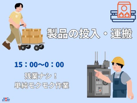 《夜中に終わるオシゴト・残業ナシ☆》機械に製品を投入して運搬のみ!モクモク動きのある作業