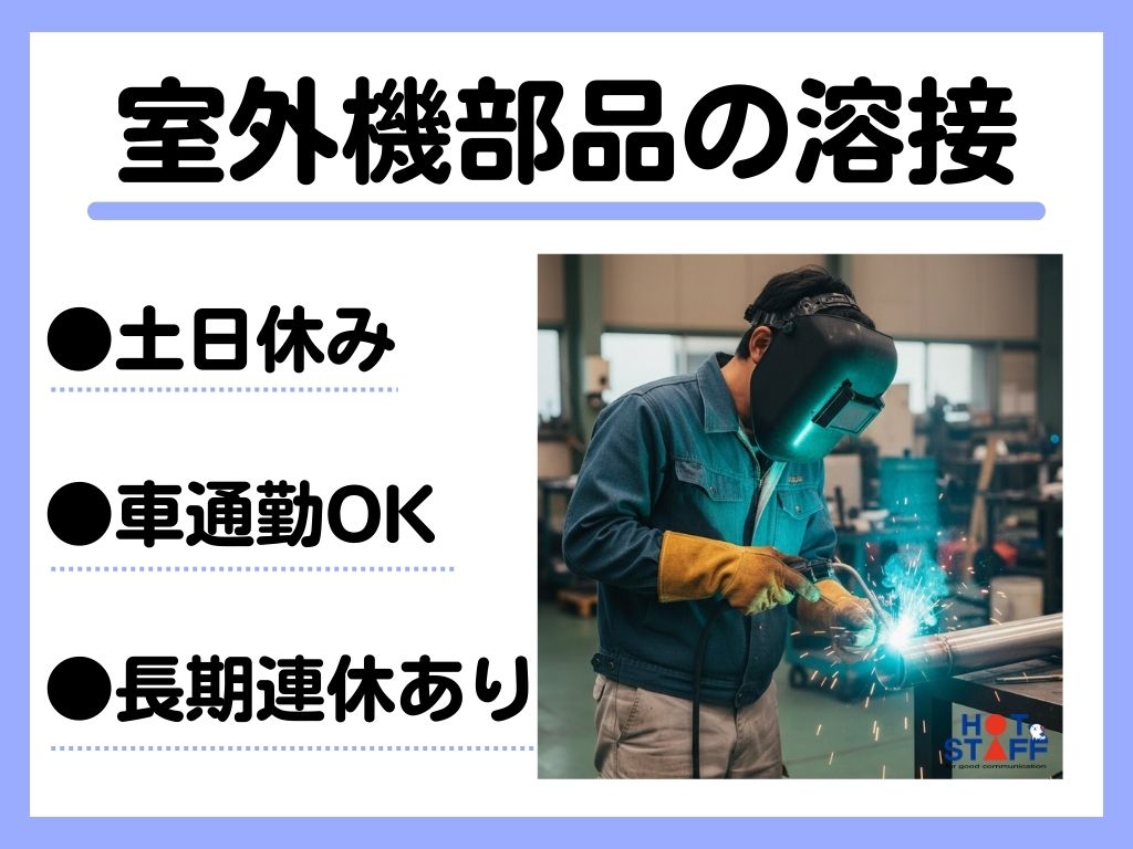 《室外機部品のTIG溶接・ガス溶接》8:00~17:10/土日休み/車通勤OK/残業ありでガッツリ稼ぐ!