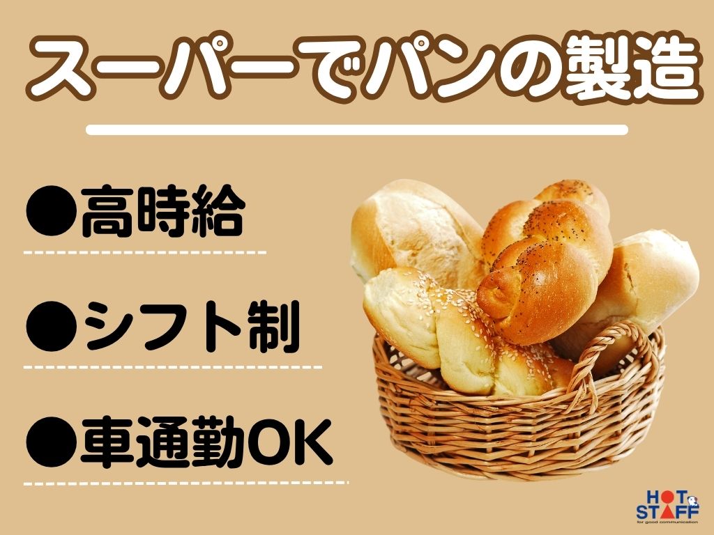 《ベーカリーコーナーでパン生地を成型して焼いて袋詰め》7時~16時/車通勤OK/経験者の募集です