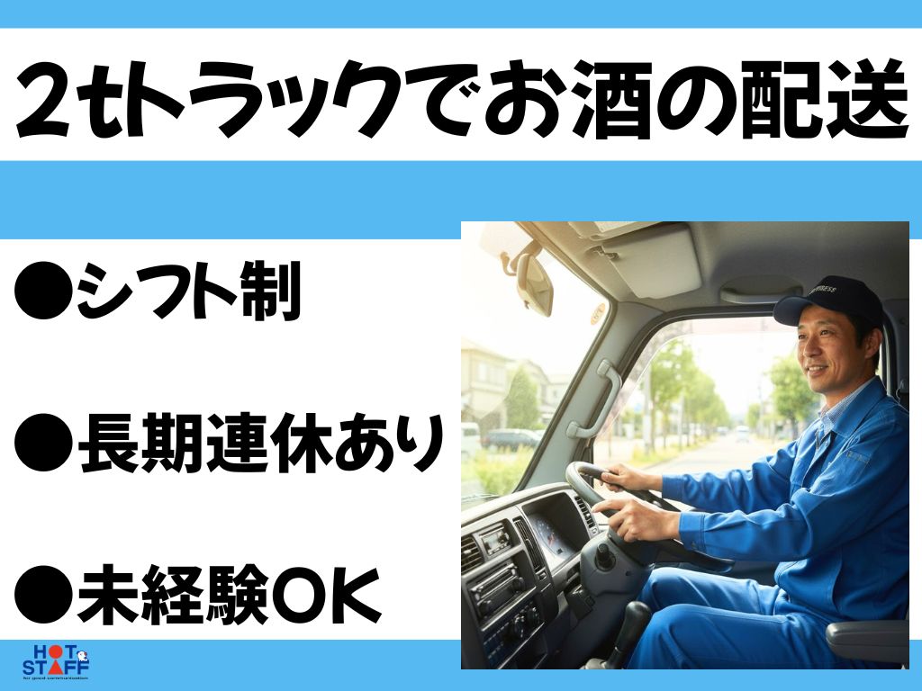 《2トントラックでお酒を配送》8時~17時/日休み+シフト制/月収25万円以上/未経験OK◎