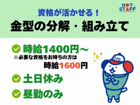 <完全土日休み×残業なし>金型の「お掃除&組み立て」★9時〜18時の安定Work!資格取得支援あり!