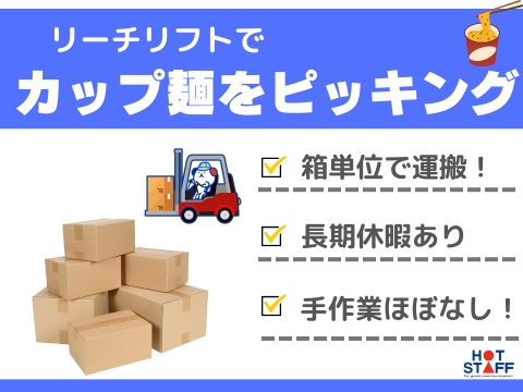 手作業はほとんどなし!/高収入◎/リーチリフトでカップ麺をケース単位でピッキング・運搬作業