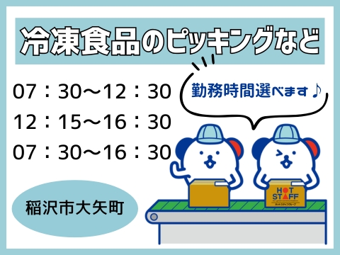 7:30~12:30/時短勤務/髪色自由・ネイルOK◎/冷凍食品を指定の棚へしまったり箱に入れたり!