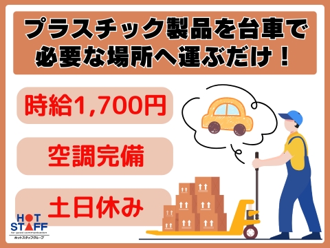 6:25・16:00の2交替/土日休み/1700円でガッツリ稼げる/プラスチック製品を台車で運ぶだけ