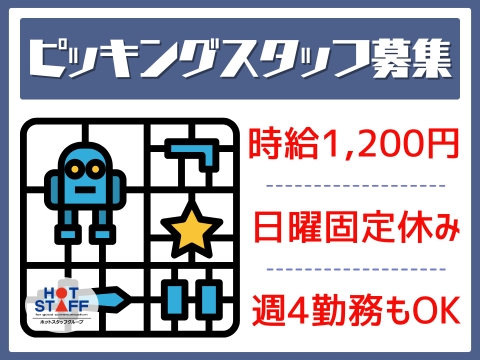 9時~17時/残業無し/日曜固定休みのシフト制/週4勤務OK/リストに従ってプラモデルを集めるお仕事