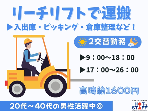 2交代で稼げる!!/時給@1600/土日休み☆/リーチリフト6割・その他の倉庫内整理など4割◎