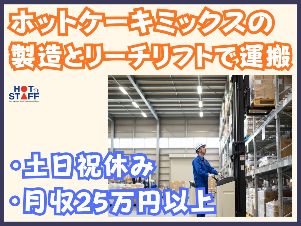 《ホットケーキミックスの製造と原料をリーチリフトで運搬♪》資格を活かす/月収25万円以上/土日祝休み