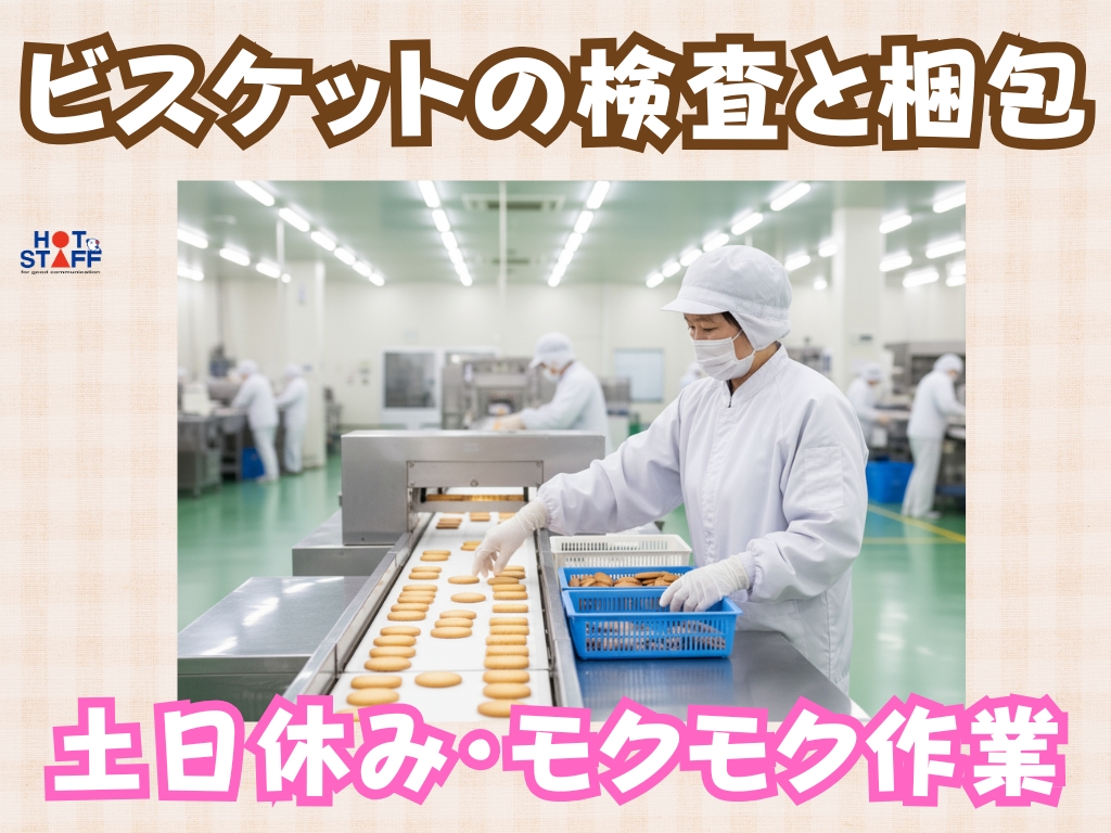 《ラインで流れてくるビスケットを検査と計量して梱包♪》未経験OK/土日休み/空調完備/モクモク作業
