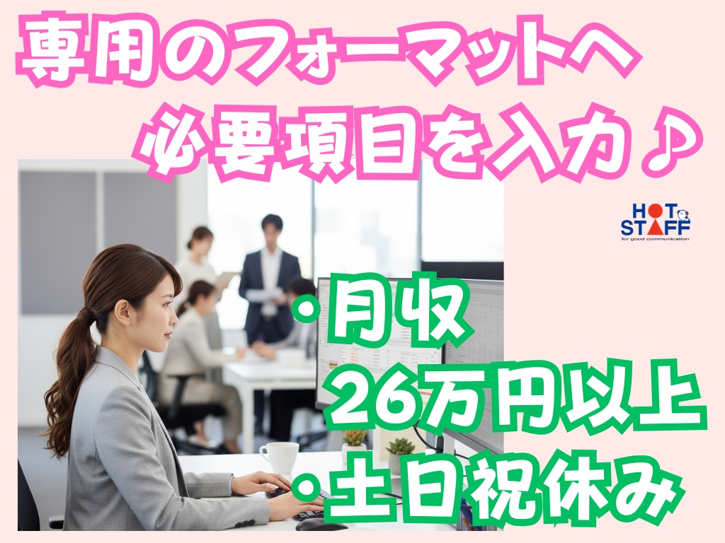 《書類作成などデータ入力メイン・フォーマットあり♪》月収26万円以上/土日祝休み/電話対応なし◎