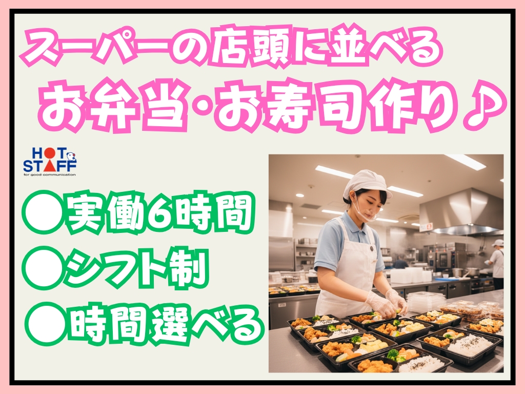 《スーパーの店頭に並べるお弁当・お寿司作り♪》未経験OK/シフトの相談◎/実働6時間/残業なし