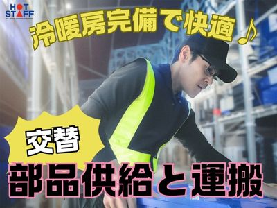 社員食堂タダ・冷暖房完備♪工場内で台車を使った部品供給&運搬|2交替・土日休み
