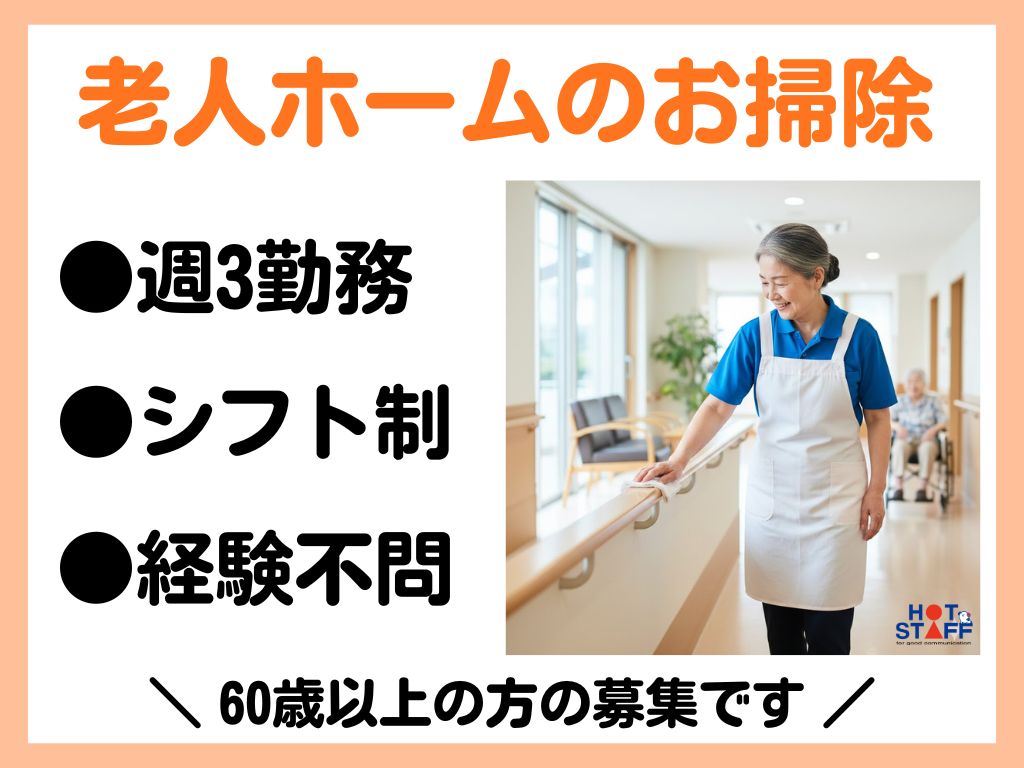 《老人ホーム内のお掃除やお洗濯♪》9時~14時/平日のみ/週3勤務/経験不問/60歳以上の方の募集です◎