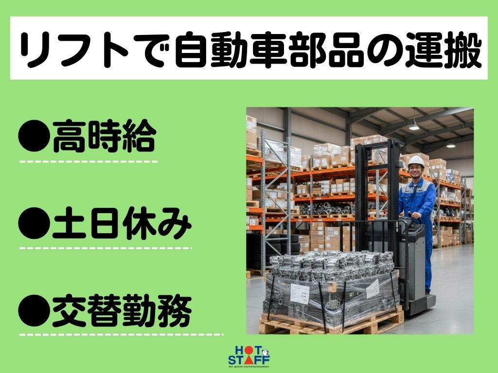 《カウンター・リーチリフトで車部品がのったパレットを運搬》月収26万円以上/交替勤務/リフトが9割!