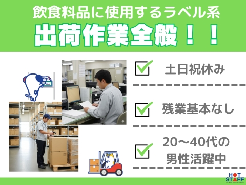 残業基本なし/土日祝休み/飲料品のラベルを出荷全般業務/伝票発行からリフトでの運搬作業まで