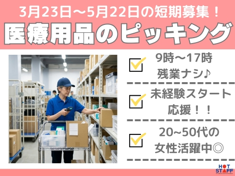 【5/22までの短期】9:00~17:00/空調完備/未経験OK/医療用品を棚から集め箱に詰めるだけ