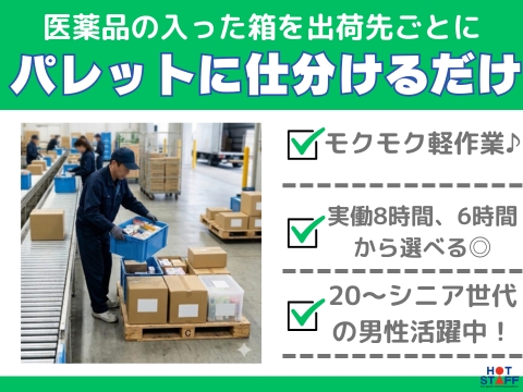土日休み/土曜+平日1~2日休みもOK/8時~17時/医薬品の入った箱を出荷先ごとに仕分けるだけ!