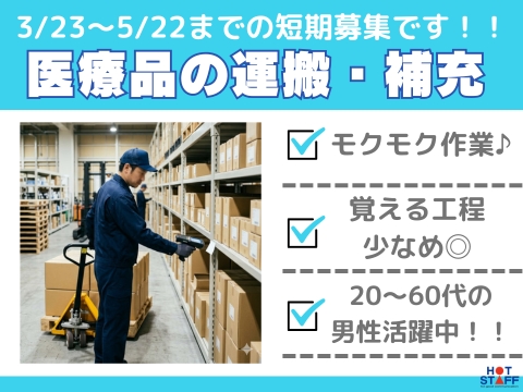 【5/22までの短期募集!】9:00~勤務/医療品の載ったパレットをハンドリフトで運搬して在庫補充