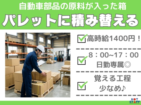 高時給1400円!/モクモク作業♪/樹脂原料が入った箱をパレットへ移し替えてPPバンドで固定するだけ