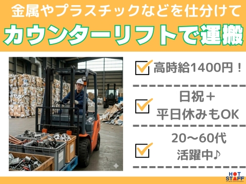 時給1400円!/8:00~17:00/金属や木材を仕分けてコンテナをカウンターリフトで運搬◎