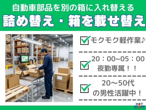 夜勤専属【月収27万円以上可能!】/車部品の詰め替え・乗せ換え作業/1つずつ別の箱に入れ替えるだけ!