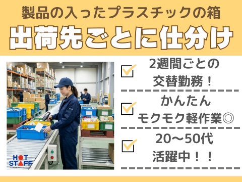2週間ごとの交替勤務!/シンプル軽作業/重量物ナシ!/箱単位でワイヤーハーネスの仕分け/未経験OK!