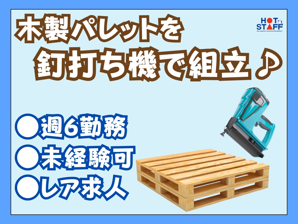 《木材に型をはめ込んで釘打ち機で釘打ち♪》未経験OK/モクモク作業/週6勤務/月収28万円以上