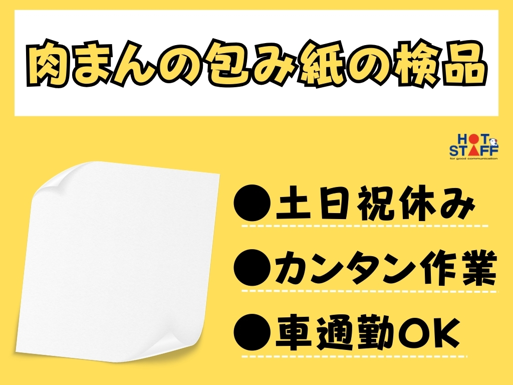 《肉まんの包み紙をペラペラめくって印字のチェック》土日祝休み/軽作業/車通勤OK/8時半~17時半