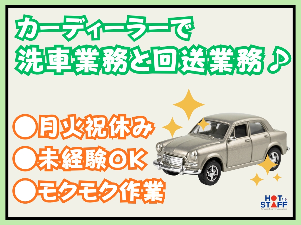 《カーディーラーで洗浄業務と回送業務♪》未経験OK/月火祝休み/残業なし/9時半スタート/モクモク作業