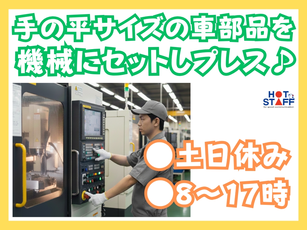 《手の平サイズの車部品を機械にセットしプレス♪》未経験OK/土日休み/重量物なし/8時~17時