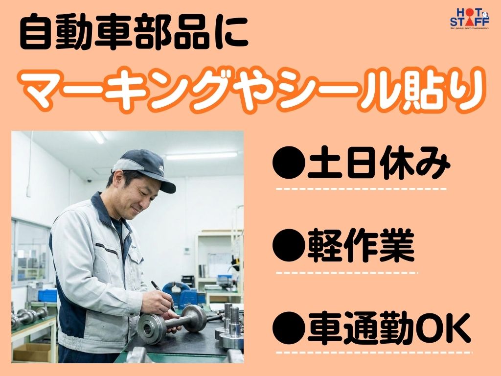 《部品にペンでマーキングやシール貼りなどの軽作業!》日勤/選べる勤務時間/土日休み/車通勤OK◎
