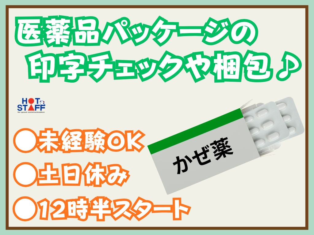 《医薬品パッケージの印刷ミスなどを確認して梱包♪》未経験◎/12時半~21時/土日休み/空調完備