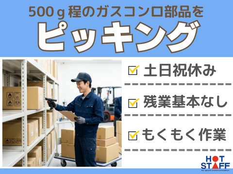 《500gほどのガス機器部品のピッキングスタッフ》土日祝休み/残業基本なし/もくもく作業/日勤専属
