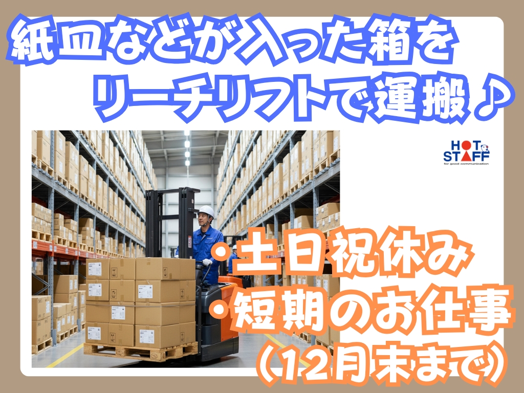 《紙皿や紙コップなどが入った段ボールをリーチリフトで運搬♪》12月末までの短期/土日祝休み/急募