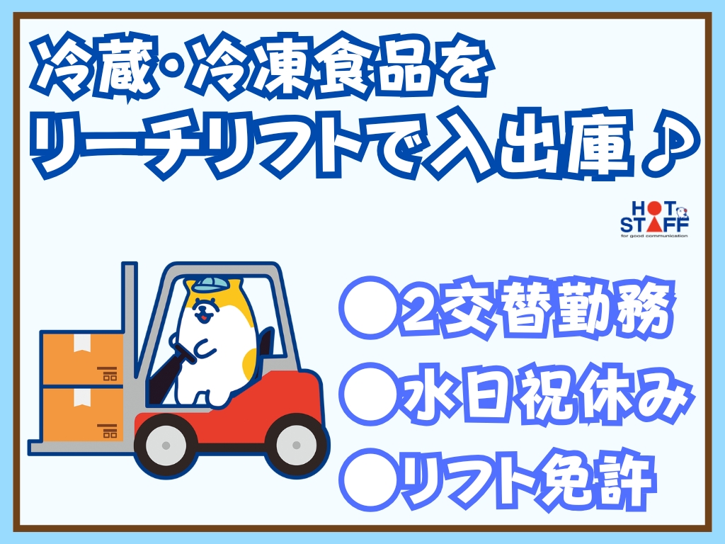 《冷蔵・冷凍食品をリーチリフトで運搬や入出庫作業♪》資格を活かす/2交替勤務/水日祝休み/残業なし