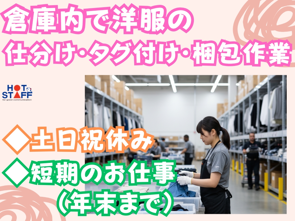 《倉庫で洋服の入荷・仕分け・タグ付け・梱包作業♪》年末までのお仕事/未経験OK/土日祝休み