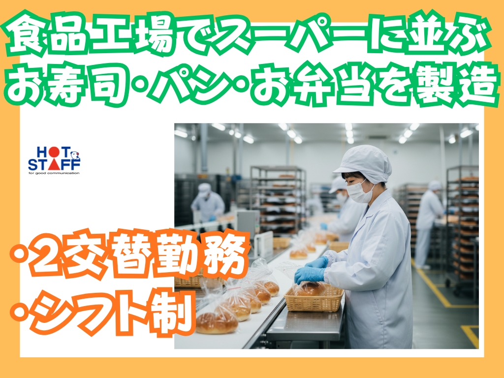 《スーパーの店頭に並ぶお寿司・パン・お弁当を製造♪》2交替勤務/未経験OK/無料P完備/シフト制